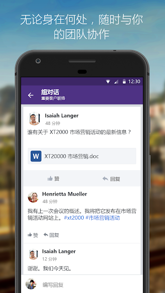 تمكنك Viva Engage من الانخراط على الهاتف المحمول بطريقة بديهية على Android. شارك الصور ومقاطع الفيديو مع زملائك ، والاستجابة بصورة سريعة للترحيب بموظف جديد أو مدح شخص ما.