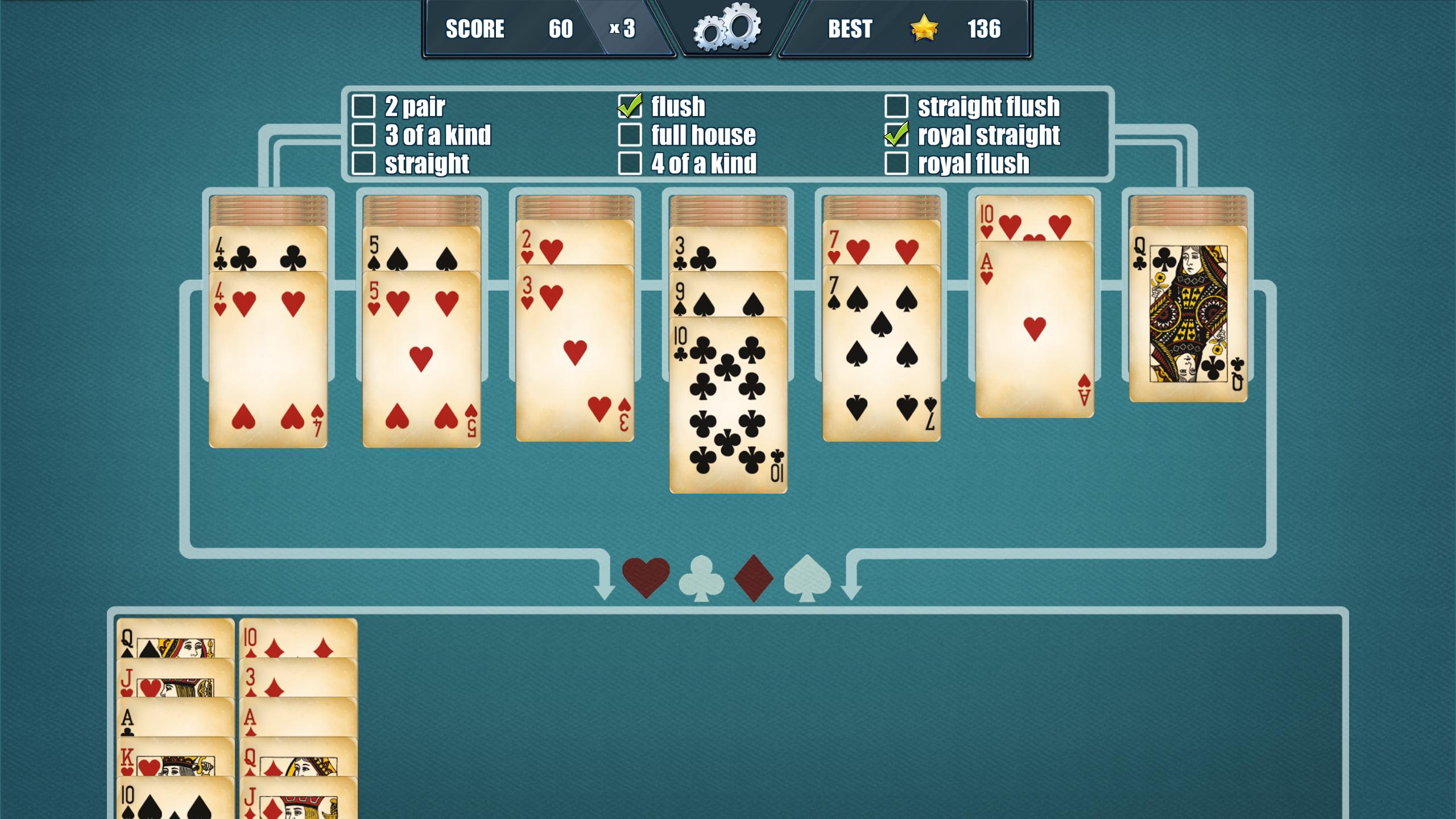 ポーカーは、この革新的な新しいマッシュアップでソリティアに会います!ソリティアスタックの間にカードをドラッグして、フルハウスやロイヤルフラッシュなど、ポーカーハンドを作成します。新しい手がそれぞれスコア乗数を増やして、リーダーボードのトップに到達します!